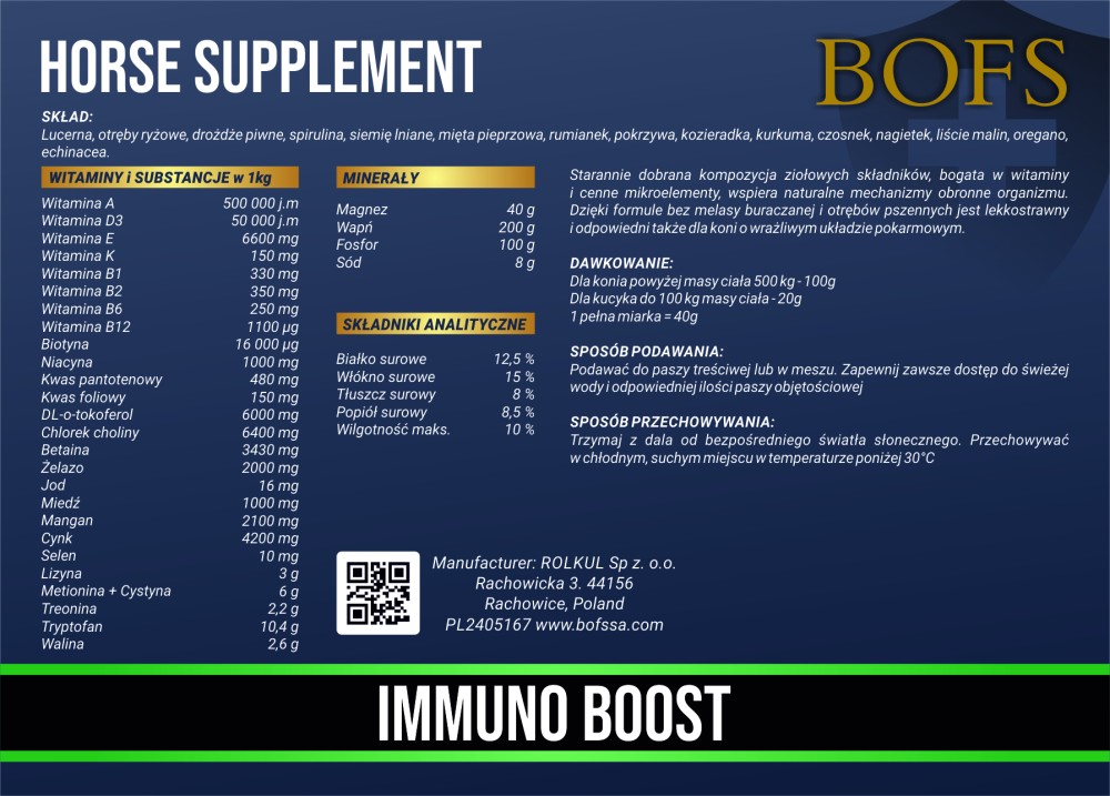 IMMUNO BOOST to starannie skomponowana mieszanka ziół, bogata w naturalne witaminy, minerały i bioaktywne substancje roślinne, wspiera odporność konia, wzmacniając jego naturalne mechanizmy obronne. Dzięki lekkostrawnej formule, pozbawionej melasy buraczanej i otrębów pszennych, suplement jest odpowiedni również dla koni o wrażliwym układzie pokarmowym.