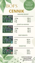 Skład: Lucerna, otręby ryżowe, drożdże piwne, spirulina, siemię lniane, mięta pieprzowa, rumianek, pokrzywa, kozieradka, kurkuma, czosnek, nagietek, liście malin, oregano, echinacea.